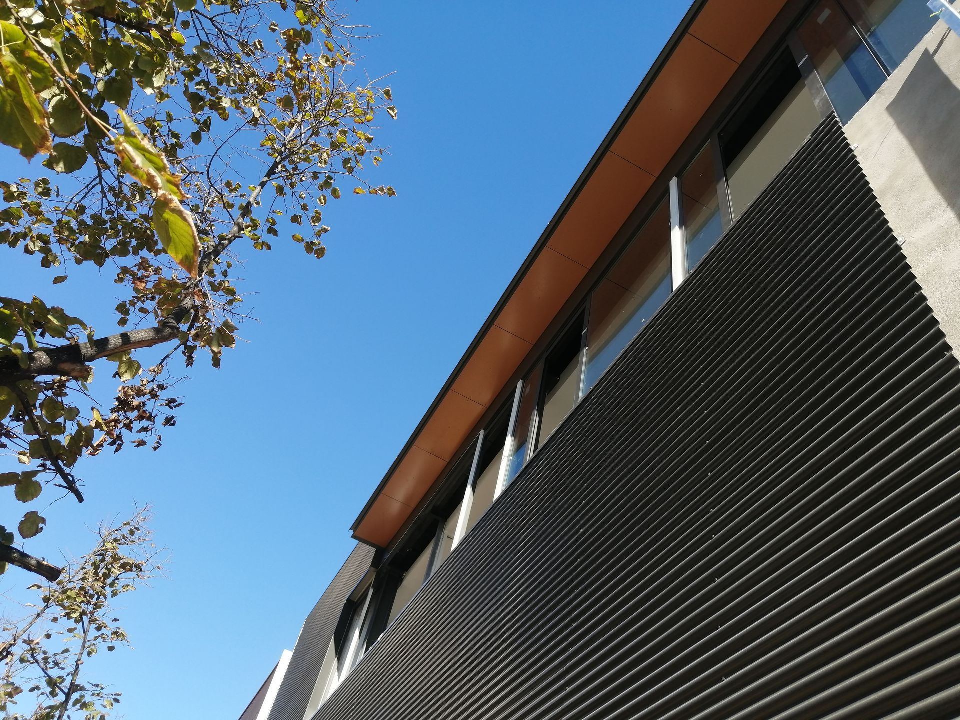 Ejecución de la envolvente del edificio nuevo y alero en remonta de edificio existente, realizando una subestructura de aluminio en fachada y aleros facilitando así la ventilación de la misma, aislamiento mediante panel semirígido de lana de roca y un revestimiento alternativo compuesto de chapa minionda, muro cortina de policarbonato y panel composite ETALBOND.